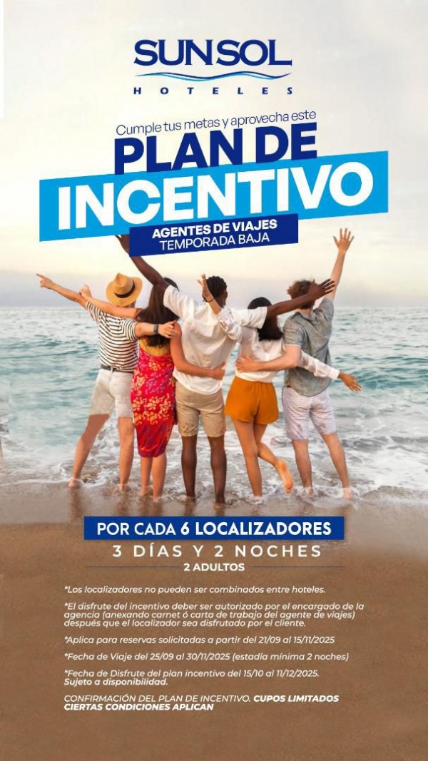 - Por cada 6 localizadores gánate 3 Días y 2 Noches para 2 adultos en Sunsol Hoteles.