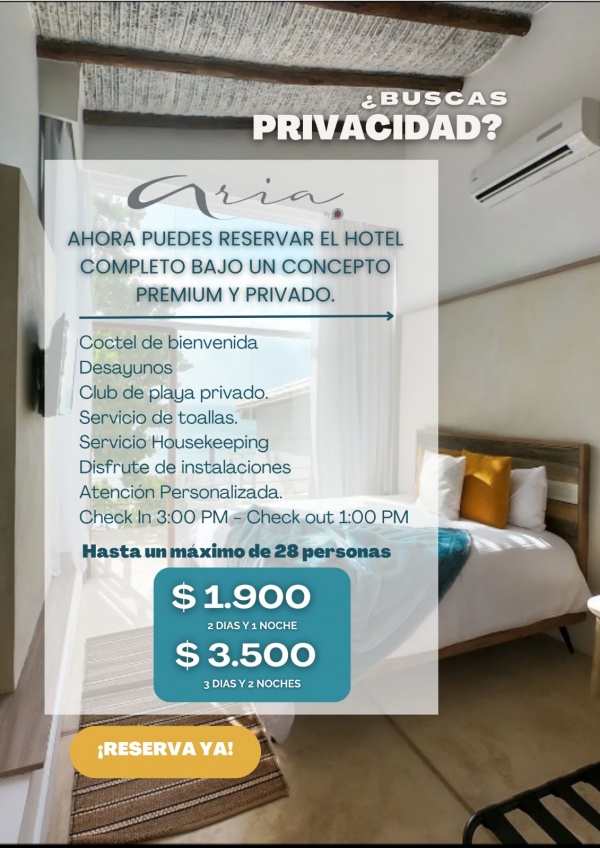 - Ahora puedes reservar el hotel completo bajo un concepto Premium y privado. Solo tú, tu familia y el staff de Aria By atendiéndoles.