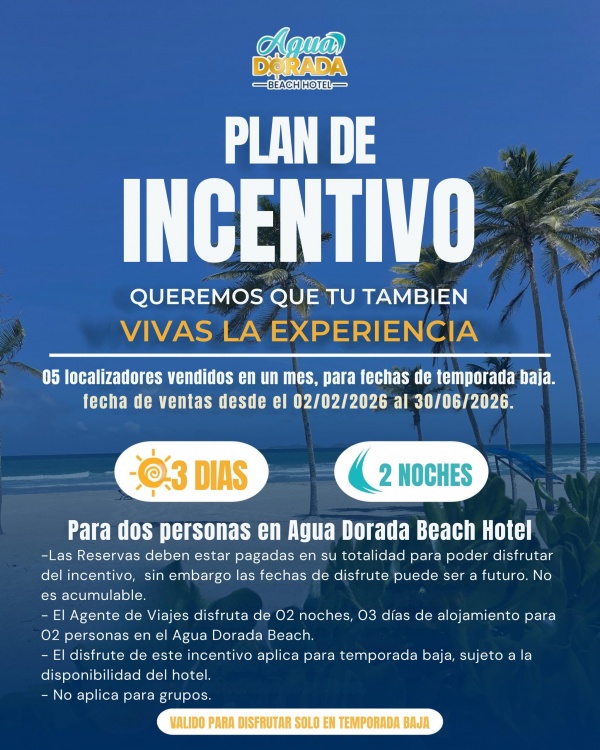 - El agente de viajes disfrutará de 2 noches, 3 días de alojamiento para 2 personas en el Hotel Agua Dorada Beach.