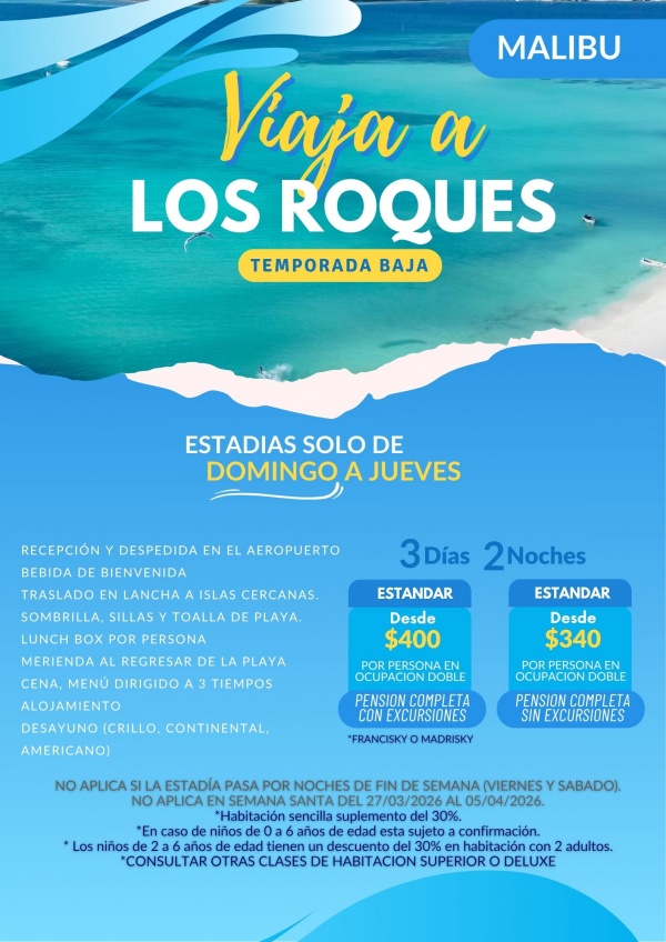 ¡¡PRECIOS ESPECIALES!! DE DOMINGO A JUEVES EN TEMPORADA BAJA EN POSADA MALIBU LOS ROQUES