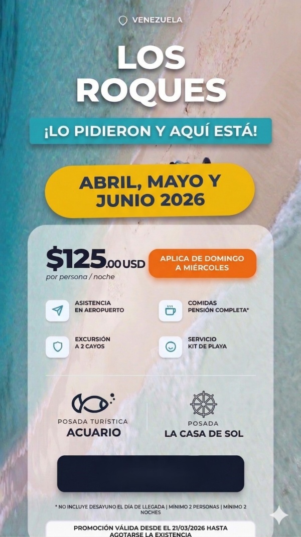 - Para cotización y reserva por favor comunicarse con nuestro equipo de Reservas a través del correo reservas@lltours.com.ve o al número de teléfono: +58 412-3594202