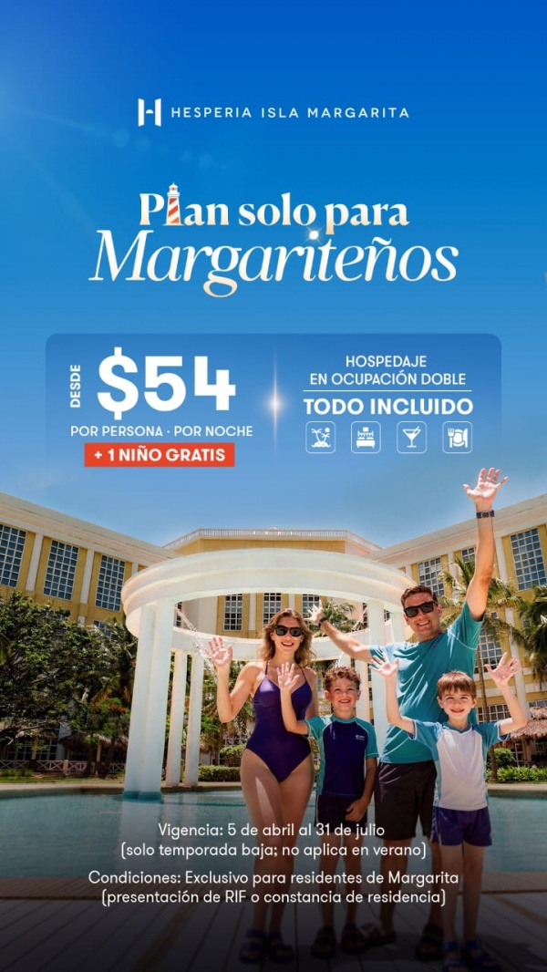¡¡PLAN SOLO PARA RESIDENTES!! DISFRUTA DESDE $54 POR PERSONA POR NOCHE + 1 NIÑO GRATIS EN HOTEL HESPERIA ISLA MARGARITA