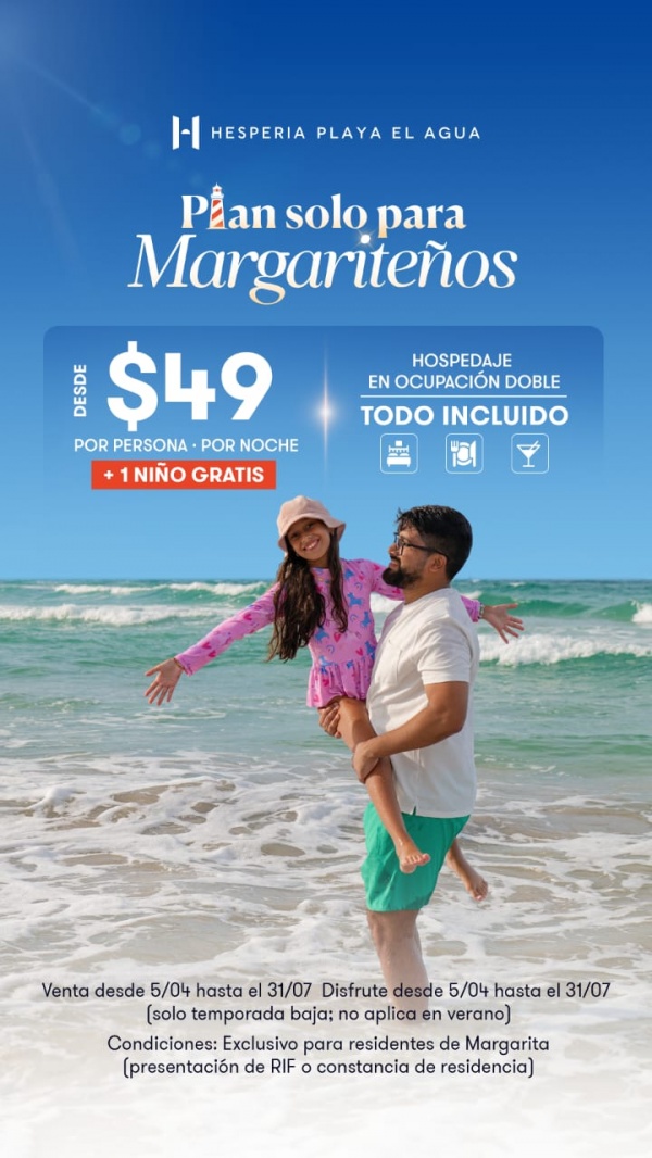¡¡PLAN SOLO PARA RESIDENTES!! DISFRUTA DESDE $49 POR PERSONA POR NOCHE + 1 NIÑO GRATIS EN HOTEL HESPERIA PLAYA EL AGUA ISLA MARGARITA